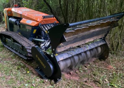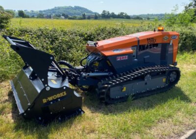 The R-Works S1250 is a unique flail attachment specifically designed for remote control tool carriers. Using a specially designed 200mm diameter Bi-directional Rotor. The forged hammer type flails can rotate 360 degrees and are mounted on low profile, rounded carriers that “roll” over any obstacle if struck, therefore reducing the risk of damage to the machine.