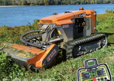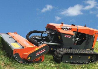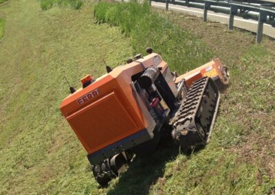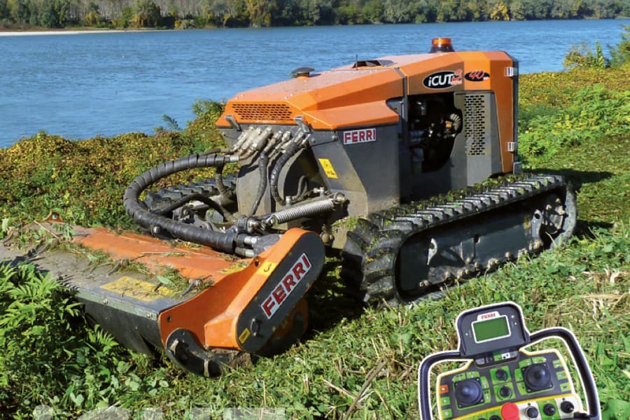 The remote controlled iCut 3 model equipped with flail head is designed to mow grass, weeds, shrubs, branches and always ensuring operator’s absolute safety. The iCut 3 specific design includes a low center of gravity , an expandable undercarriage, and the contoured track profile allows the machine to operate in highly uneven areas having maximum grip and allowing extended utilization on slopes in any direction, up to 55 °.