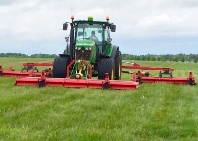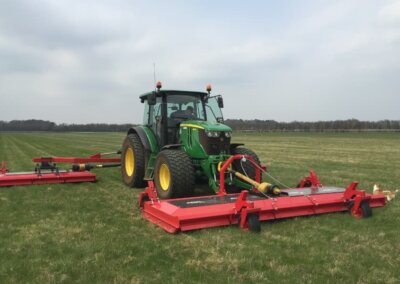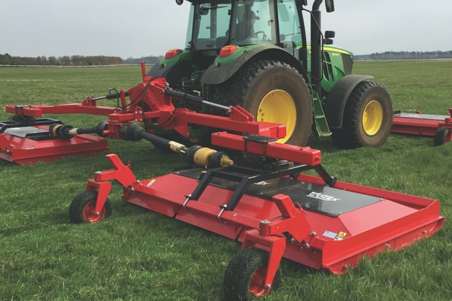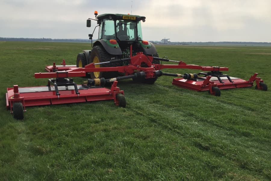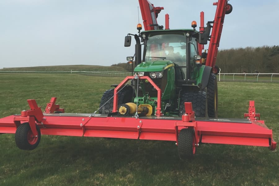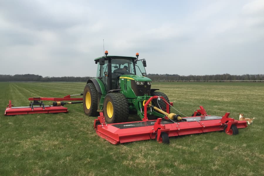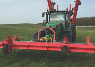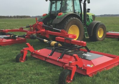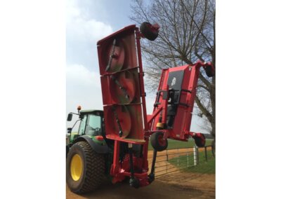 The Triple is a Wide Area Mower made up of a combination of 3 machines. Giving options from 4.5m cutting width up to 10m cutting width depending on machine combination selected. 1x Machine is front mounted therefore cutting the grass before the tractor drives over it and the 2x rear machines are on hydraulically folding arms. Mounting on Pivoting frames allows the machines to follow the contours of the ground whether on Castor Wheels or Rollers. The machines can be mounted on the arm in variable locations, so the amount can overlap between front and rear machines can be altered depending on specific uses. Machines can incorporate “Super Cut” if a higher quality finish is required.